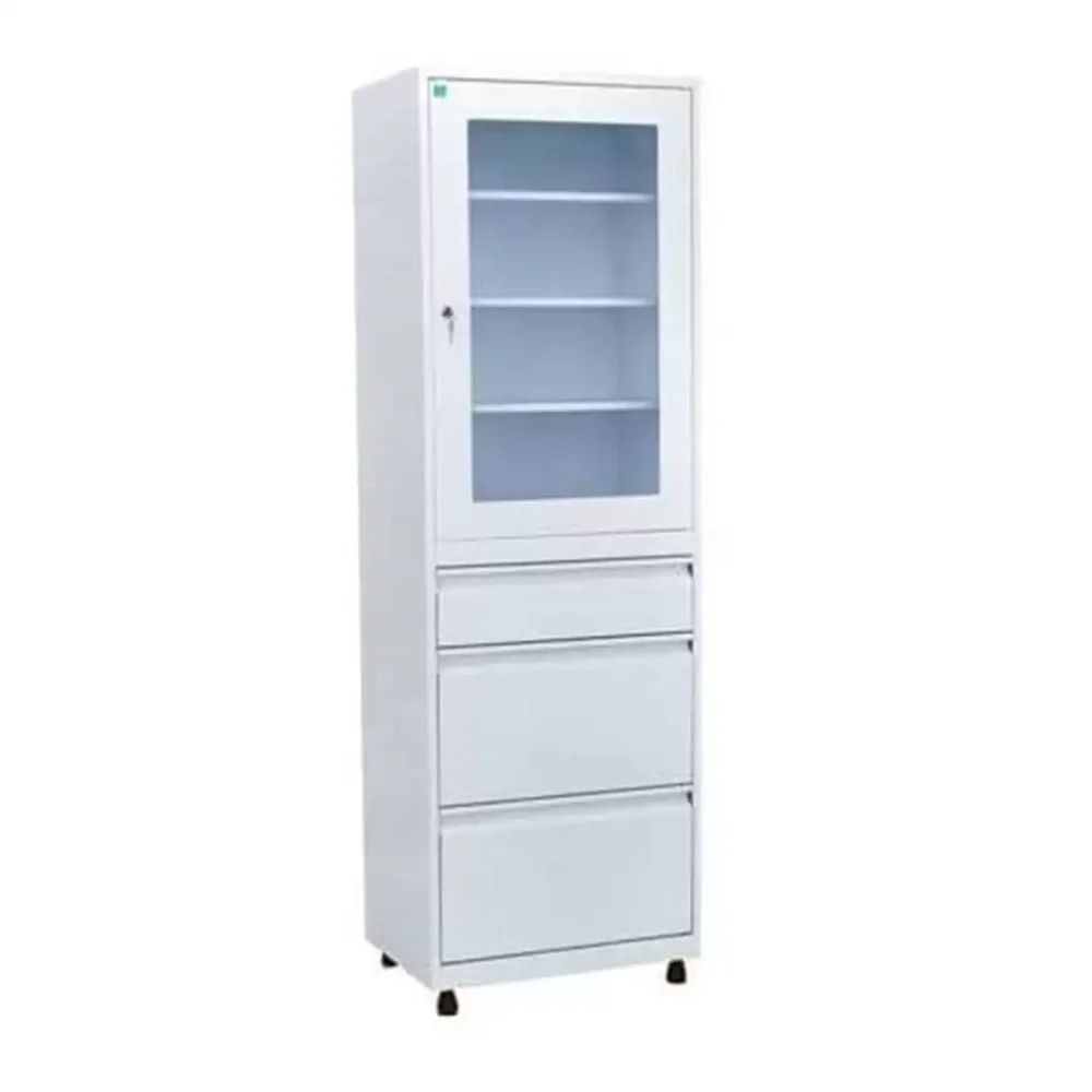 - в верхней части шкафа находится стеклянная дверь в металлической окантовке, за дверью находятся 3 металлические полки;