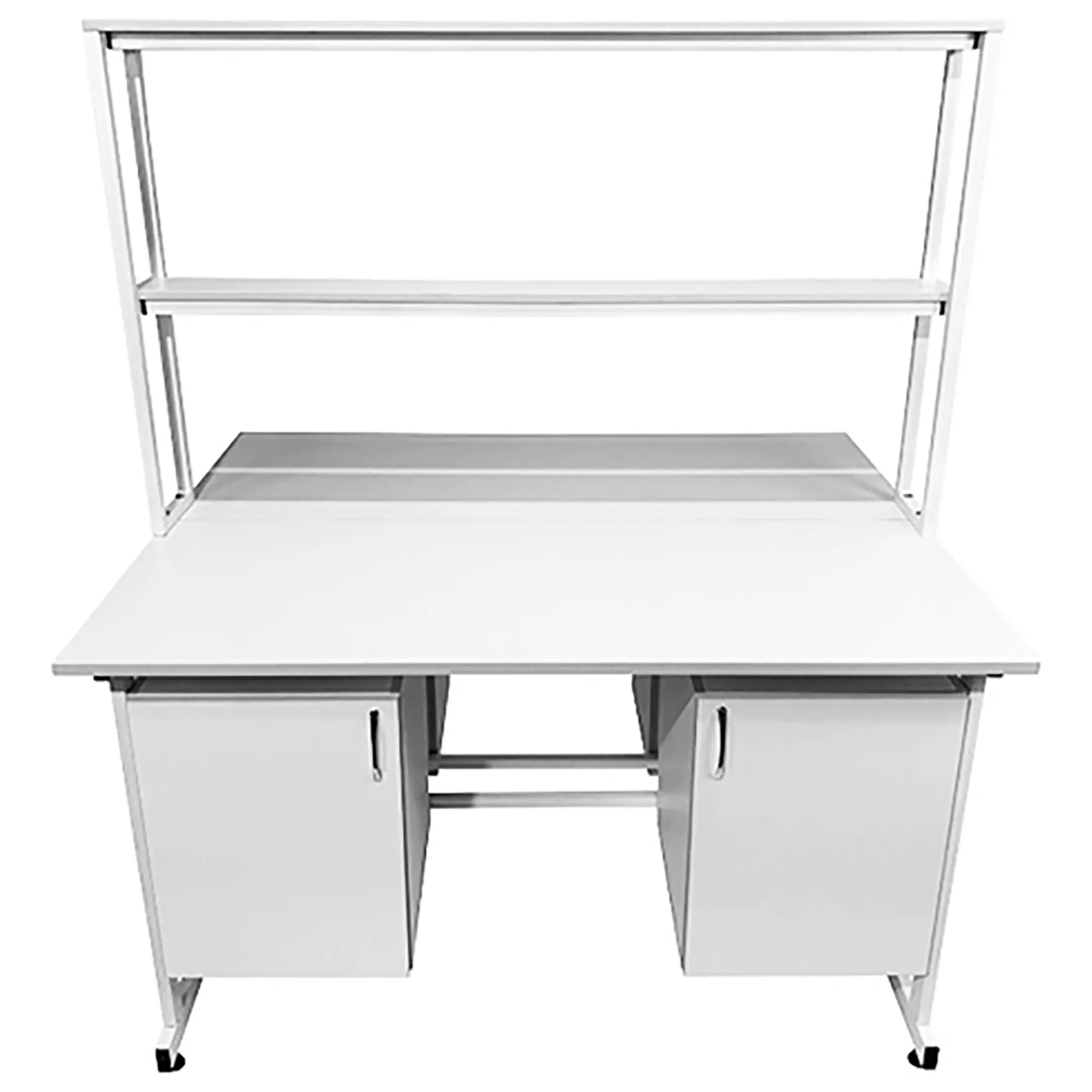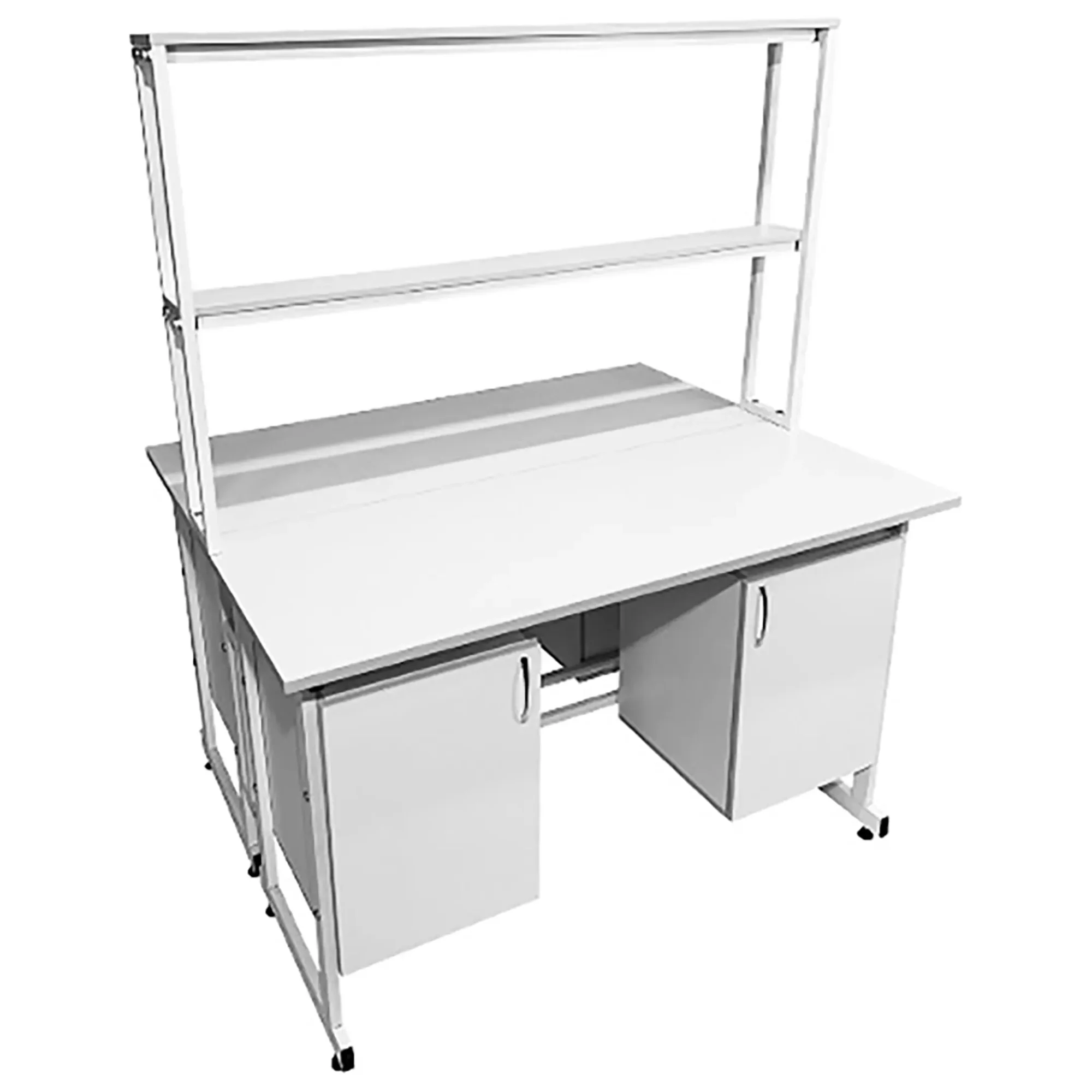 Стол лабораторный островной с надстройкой Сло 22.016 (белый) предоставляет возможность организации двух полноценных рабочих мест для сотрудников лабораторий и медицинских учреждений. Его конструкция способствует рациональному использованию пространства, обеспечивая максимальную эффективность в работе. Модель оснащена двумя рабочими местами, каждое с двумя подвесными тумбами, и центральной надстройкой с двумя полками. Каркас выполнен из стального профиля, столешницы из ЛДСП толщиной 22 мм.