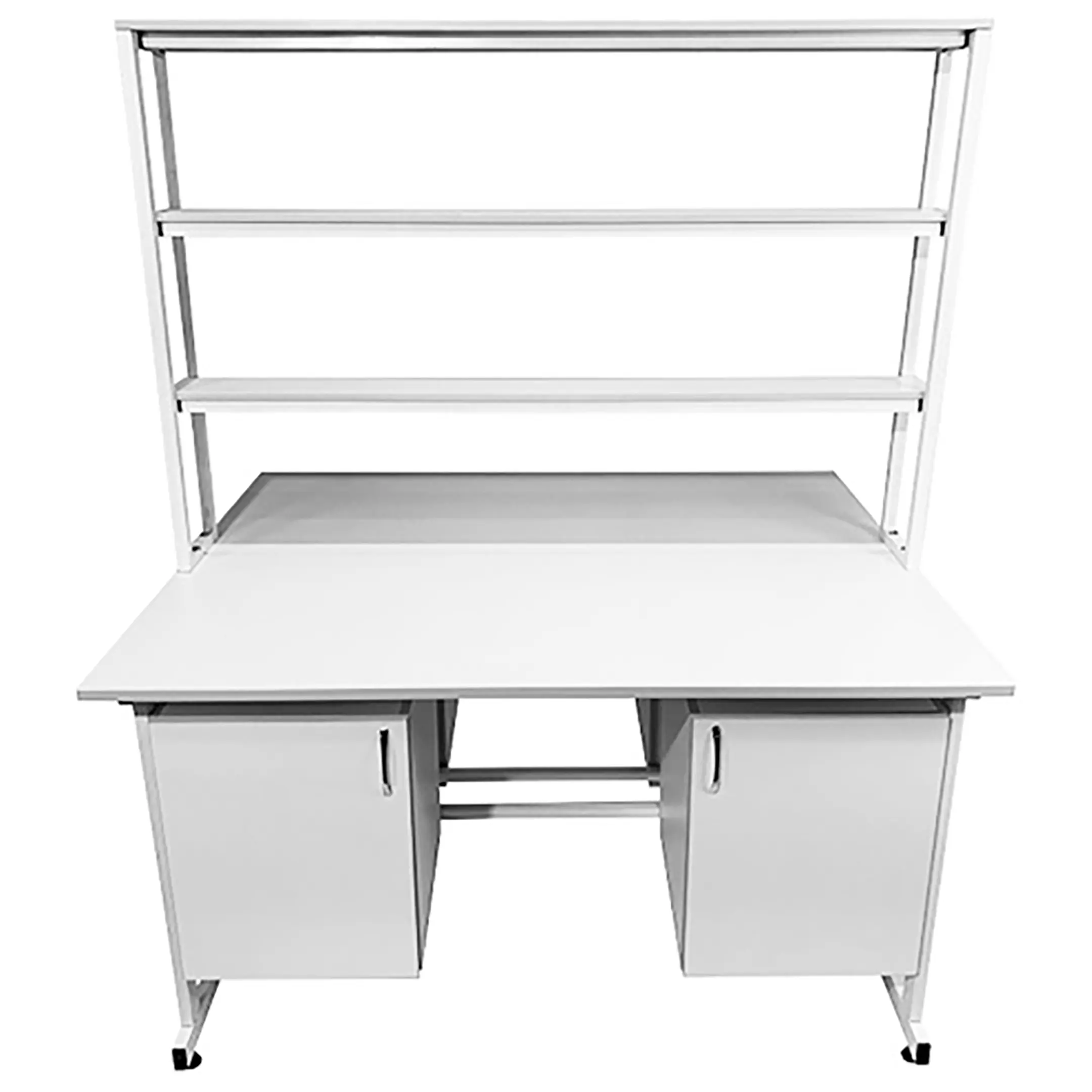 Стол лабораторный островной с надстройкой Сло 22.022 (белый) — это практичное и многофункциональное решение для организации рабочих мест в лабораториях и медицинских учреждениях. Модель позволяет удобно разместить сразу два рабочих места, максимально используя доступное пространство. Каждое рабочее место оснащено двумя подвесными тумбами с распашными дверками и полками, а центральная надстройка имеет три полки. Каркас выполнен из стального профиля, столешницы из ЛДСП толщиной 22 мм.