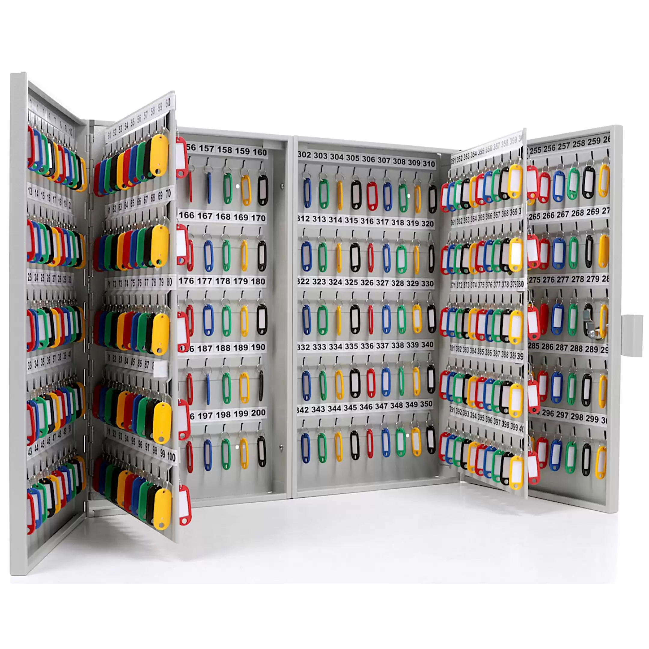 - Система строгого учета и оперативного поиска — четыреста пронумерованных ячеек и полный комплект брелков создают четкую структуру. Это основа для ведения детального журнала, быстрого поиска любого ключа по номеру и контроля над цепочкой ответственности.