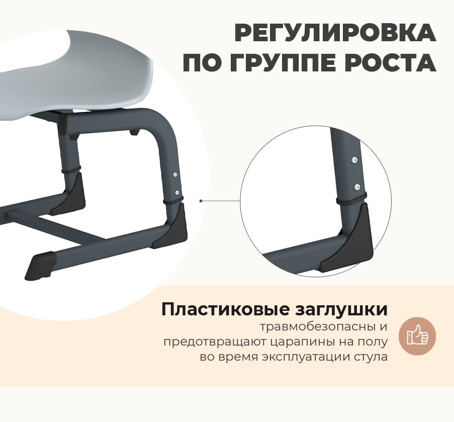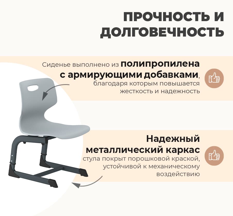 • Пластиковое сиденье и спинка — лёгкие, долговечные и легко очищаемые поверхности.