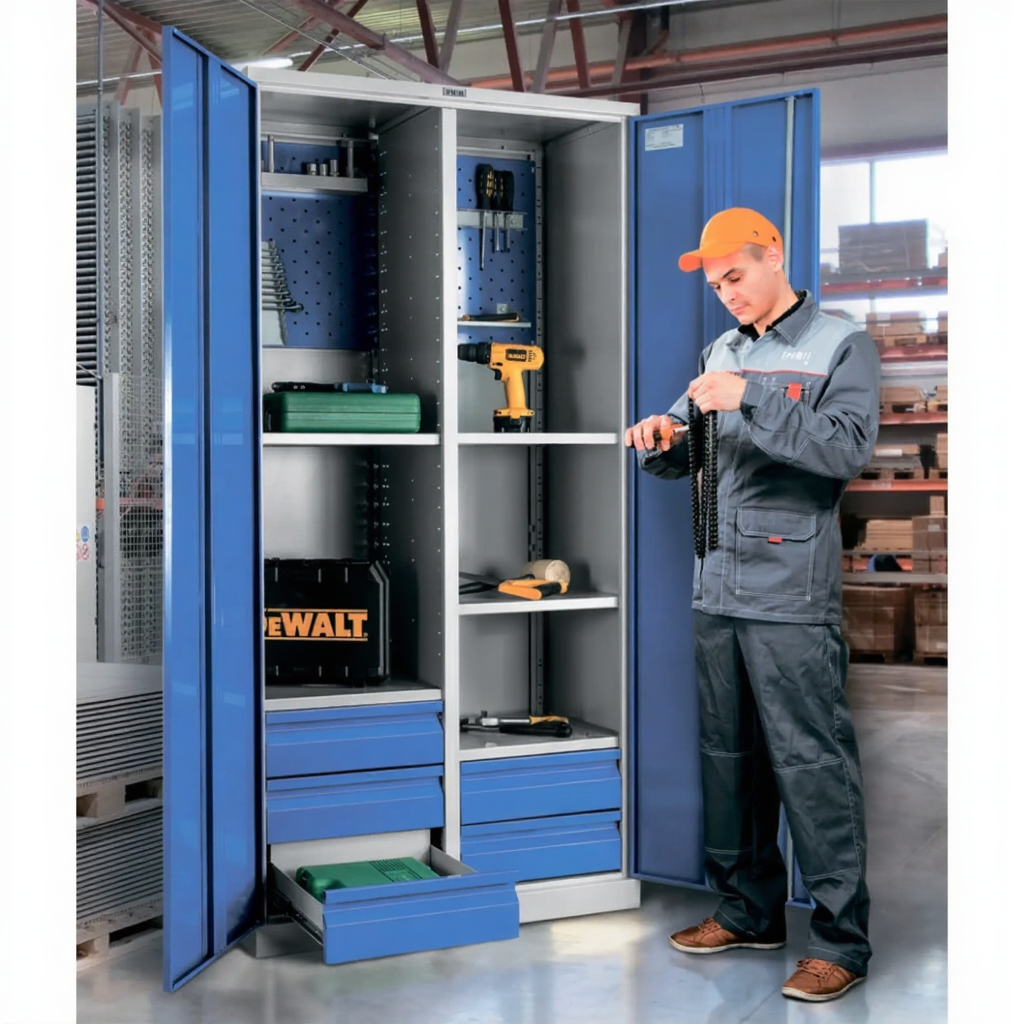- Промышленная прочность и износостойкость — шкаф изготовлен из высококачественной стали и покрыт прочным порошковым покрытием, устойчивым к ударам, царапинам, воздействию масел, технических жидкостей и интенсивной эксплуатации в жестких производственных условиях.