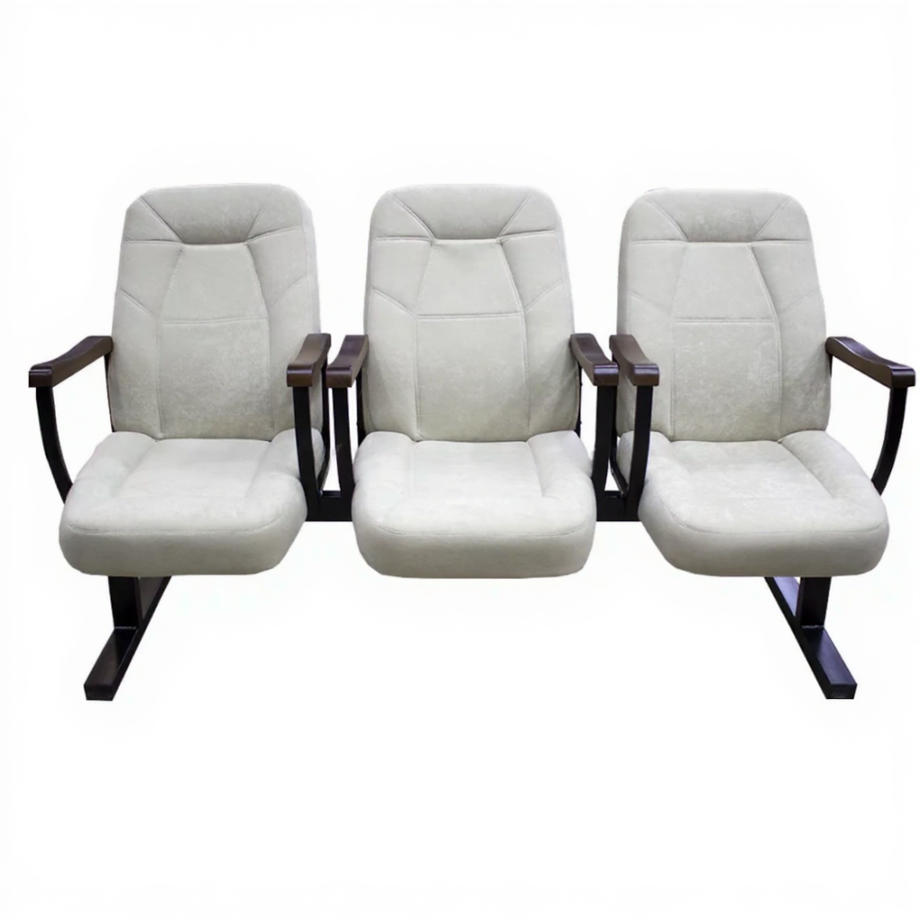 Каркас металлический, сиденья и спинка мягкие, подлокотники. Для мягких частей мы используем искусственную кожу или флок. Кресло для актового зала "Комо люкс" может быть 2-х, 3-х и 4-х местным .