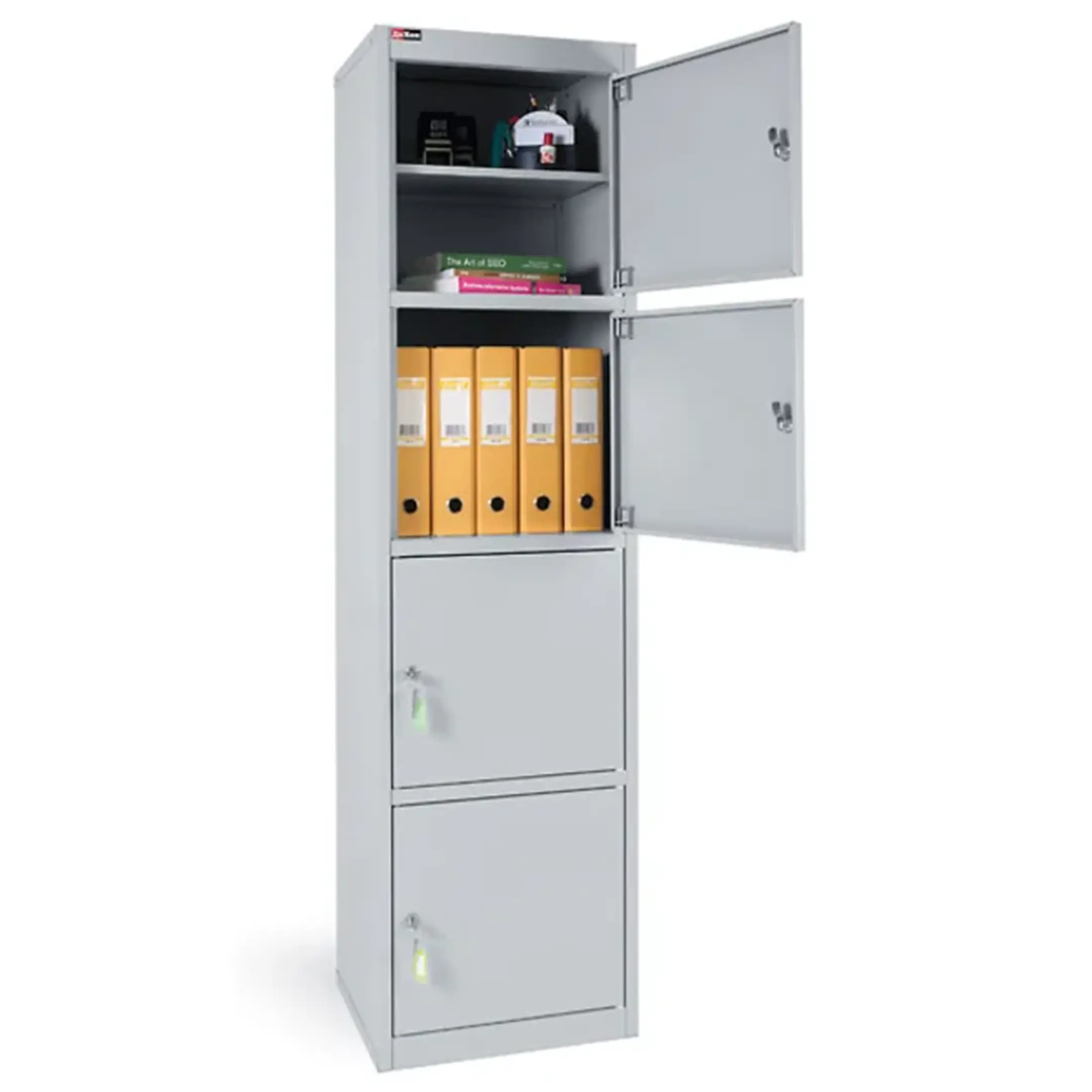 - Прочная и надежная конструкция — шкаф изготовлен из качественной листовой стали с антикоррозийным порошковым покрытием, что обеспечивает долговечность, устойчивость к механическим воздействиям и защиту содержимого. Распашная дверца запирается на надежный встроенный замок с ключом.