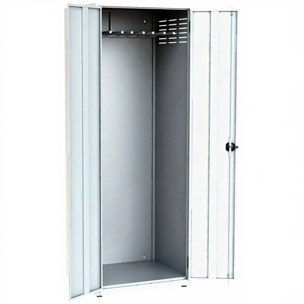 - Специализированная организация внутреннего пространства — шкаф оборудован штангой для подвешивания костюмов, полками для противогазов, касок и баллонов, а также отсеками для обуви и перчаток. Это обеспечивает порядок, быстрый поиск нужного комплекта и его целостность.
