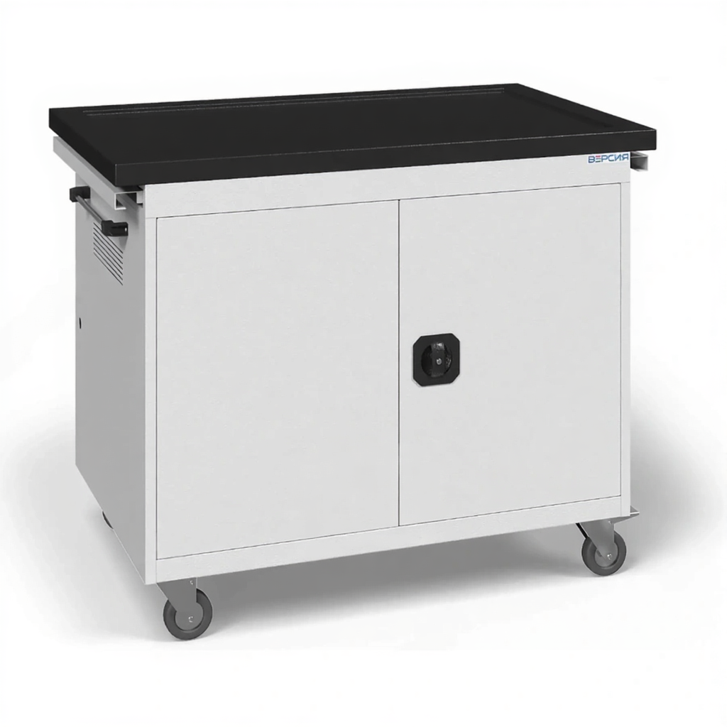 - Усиленная мобильность и безопасность — имеет прочную металлическую конструкцию, крупные колеса для легкого перемещения и надежные запирающие механизмы для защиты дорогостоящего оборудования от кражи и повреждений.