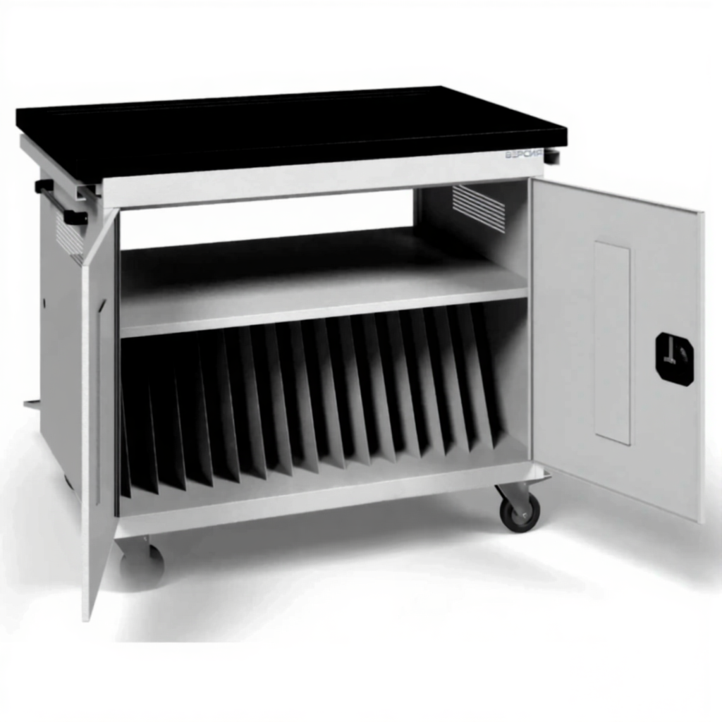 - Четкая организация и экономия времени — каждый ноутбук или планшет размещается в индивидуальном отсеке, что исключает их соприкосновение и повреждение. Процесс раздачи и сбора техники становится быстрым и упорядоченным.