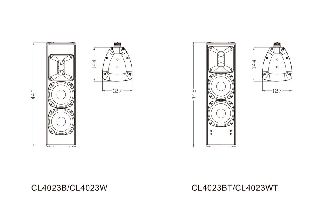 Серия CL4023 представляет собой акустическую систему колонного типа с различными цветами и функциями. Продукт соответствует стандарту IP56. Звук мягкий и сбалансированный. Корпус изготовлен из алюминиевого сплава. Буквы B и W после модели обозначают черный и белый цвет соответственно, а буква T представляет собой конфигурацию с трансформатором.
